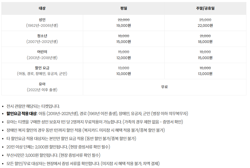 | 성인 | 19,000원 | 22,000원 | 부산 시민 3,000원 할인 |